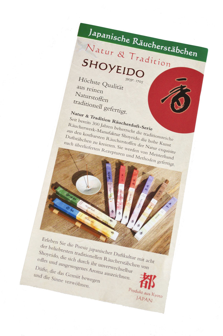 Eine der angesehensten Manufakturen für Räucherdüfte in Japan ist wohl Shoyeido in Kyoto. 1705 wurde sie von Rukubei Moritsune Hata gegründet, der das Räucherwerk nach einer besonderen Methode am Kaiserhof von Kyoto erschuf.